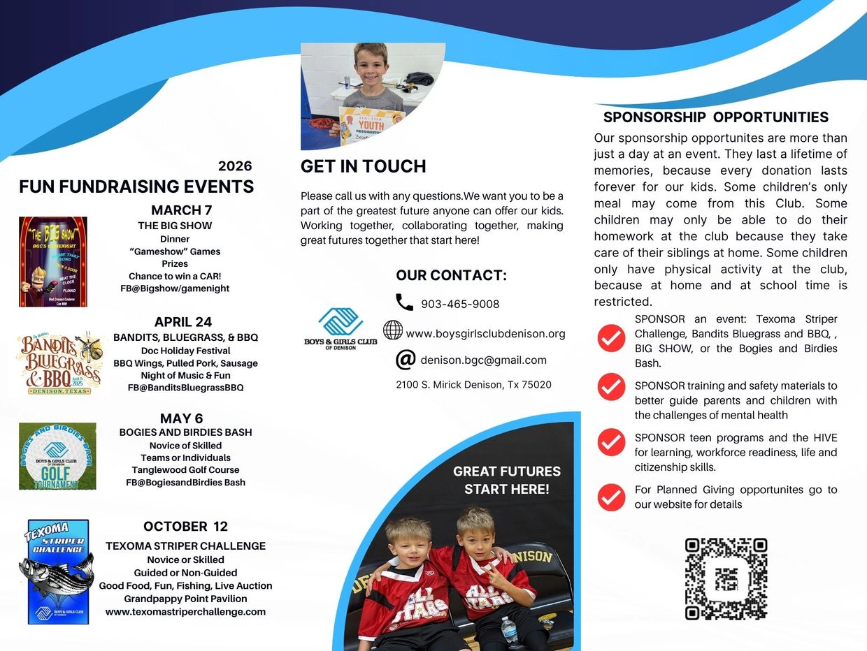 (903) 465-9008 email@ denison.bgc@gmail.com Facebook @ BGC Denison or Boys & Girls Club of Denison Athletics